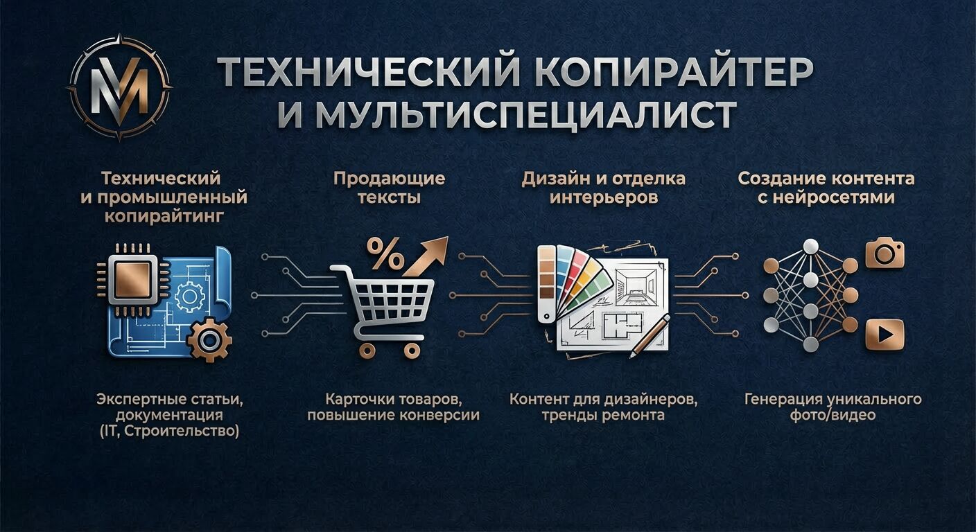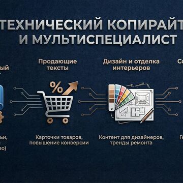 Образование + опыт в IT и строительстве: Пишу экспертные статьи, описания сложного оборудования, инструкции, коммерческие предложения для B2B. Говорю с вашими клиентами-специалистами на одном языке.
